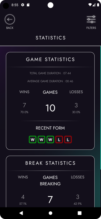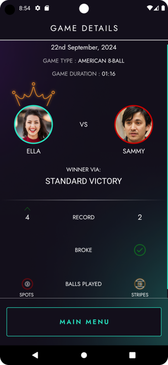 An Android app for pool enthusiasts, designed to track real-life games and generate detailed player statistics. The app offers a seamless experience for recording match data and viewing performance analytics.